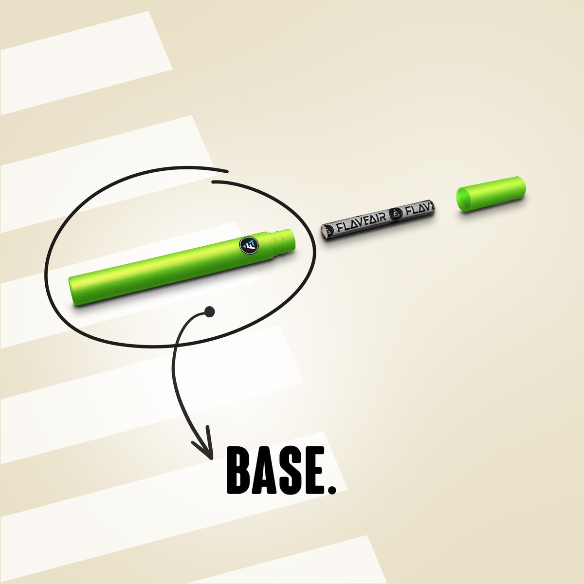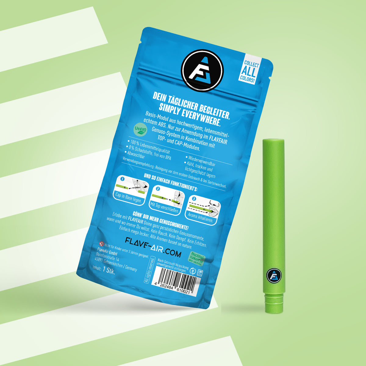 BASE nur in Kombination mit TOP und Aroma-CAP von FLAVEAIR verwenden. Reinigung vor dem ersten Gebrauch und bei Sortenwechsel. Für vollen Genuss Aroma-CAP alle 3-5 Tage auswechseln, je nach Gebrauch. Kühl, trocken und lichtgeschützt lagern.