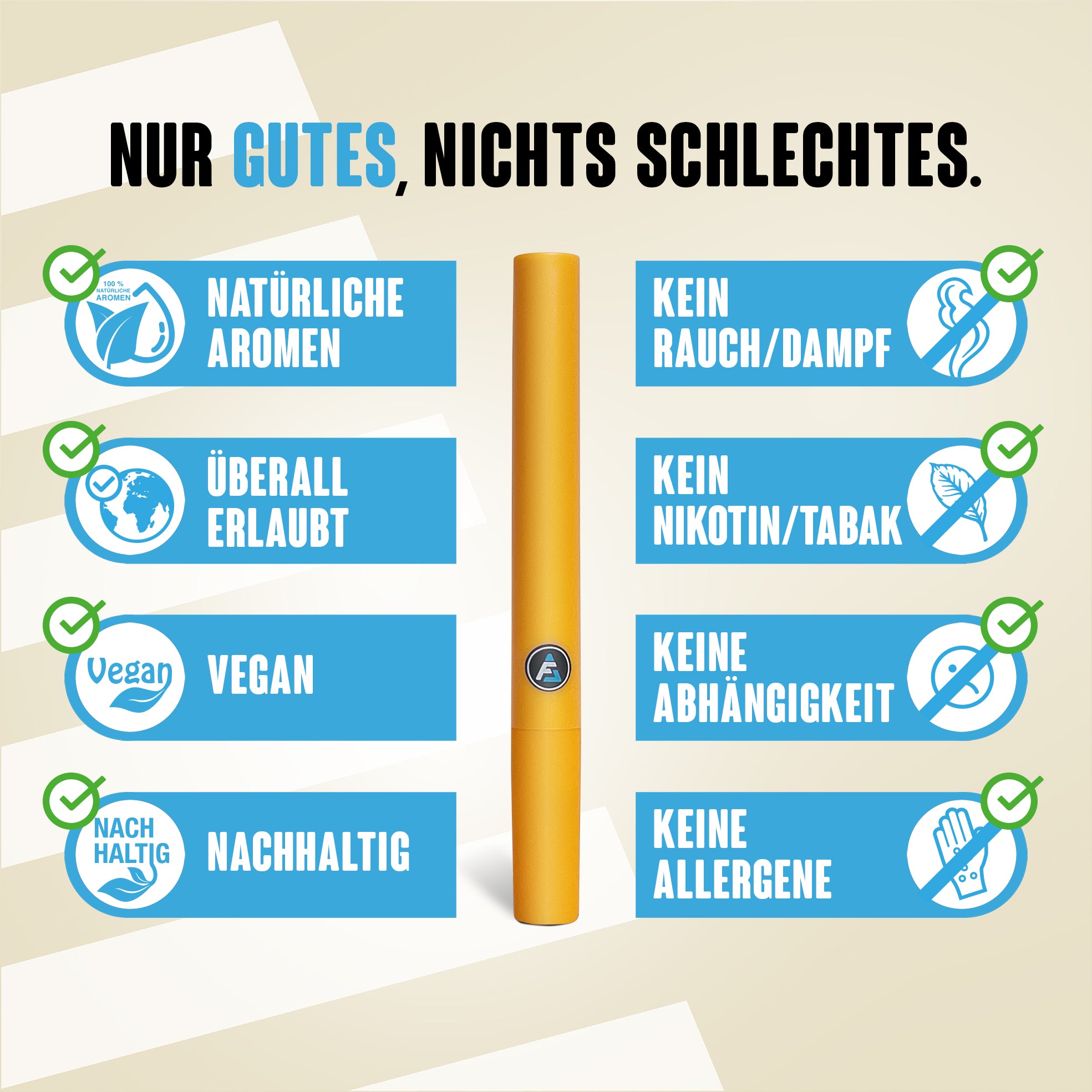 FLAVEAIR ist keine Zigarette oder Vape. Mit Deinem FLAVEAIR Genuss-System bekommst Du 100% geilen Geschmack & 100% geilen Geruch, also mindestens 200% Geschmacks-Geruch, der Dich ab sofort u.a. auch in stressigen Alltagssituationen supporten kann.