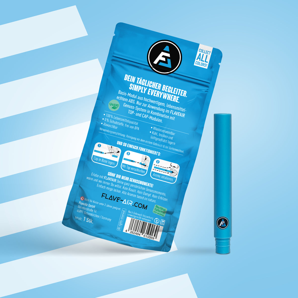 BASE nur in Kombination mit TOP und Aroma-CAP von FLAVEAIR verwenden. Reinigung vor dem ersten Gebrauch und bei Sortenwechsel. Für vollen Genuss Aroma-CAP alle 3-5 Tage auswechseln, je nach Gebrauch. Kühl, trocken und lichtgeschützt lagern.