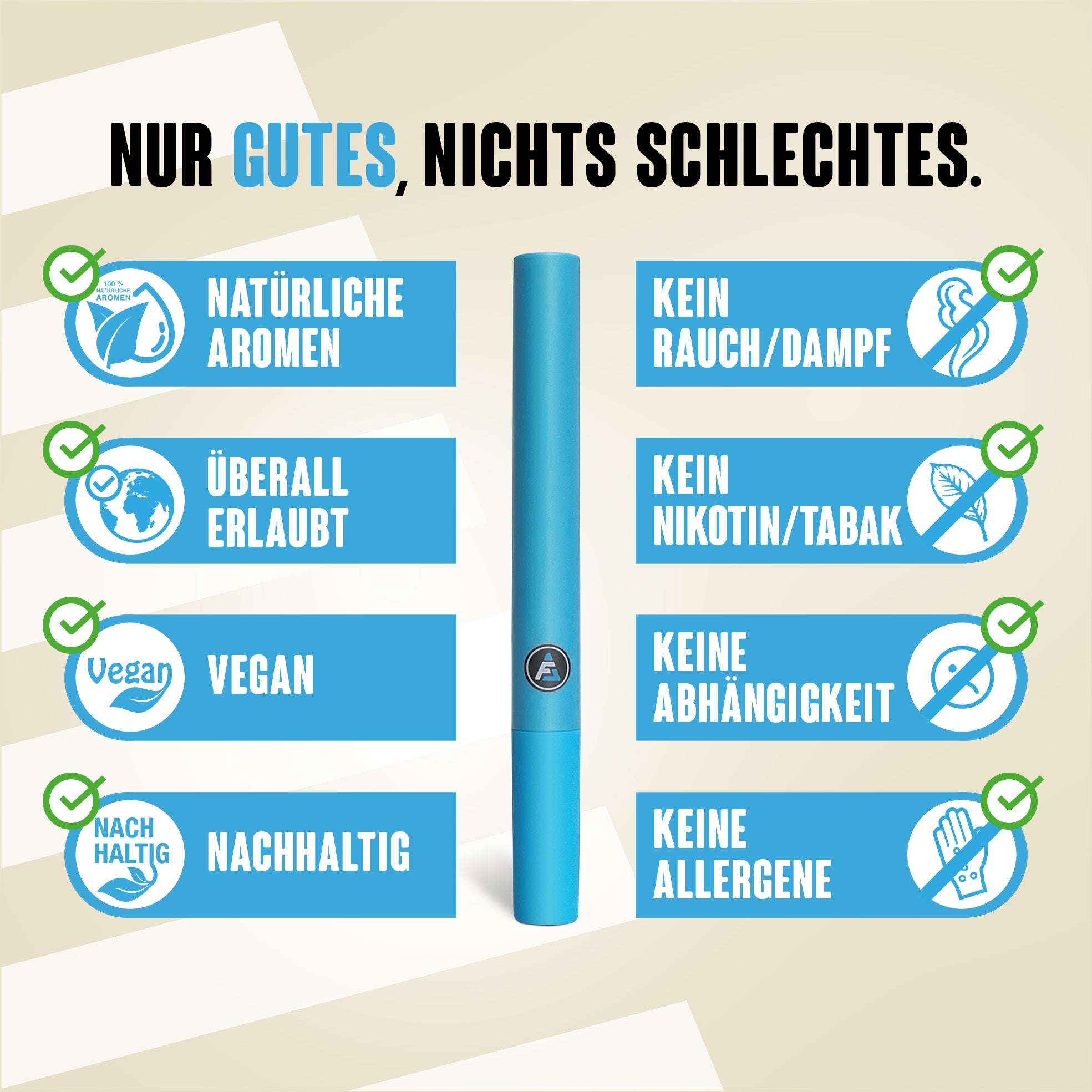 FLAVEAIR ist keine Zigarette oder Vape. Mit Deinem FLAVEAIR Genuss-System bekommst Du 100% geilen Geschmack & 100% geilen Geruch, also mindestens 200% Geschmacks-Geruch, der Dich ab sofort u.a. auch in stressigen Alltagssituationen supporten kann.
