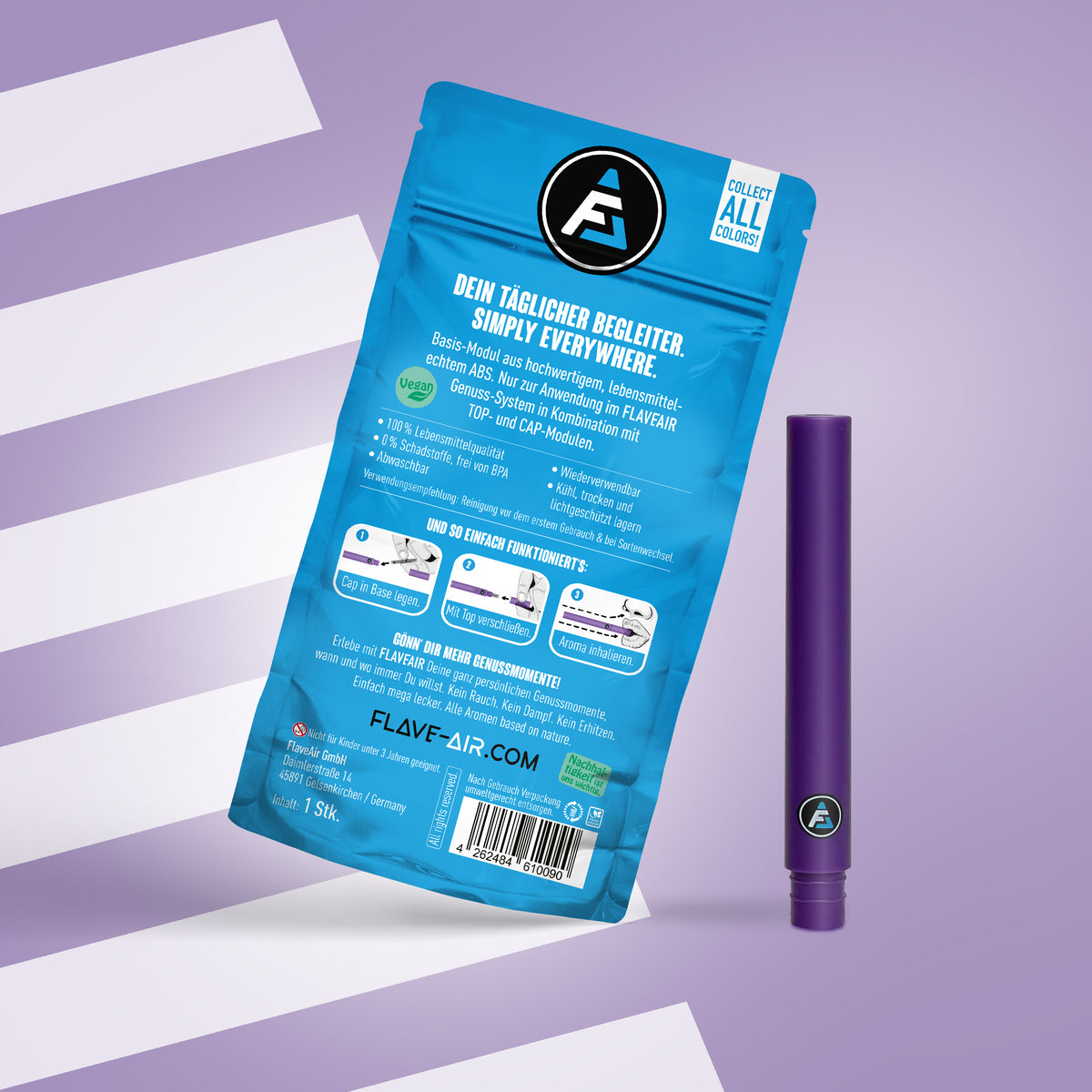 BASE nur in Kombination mit TOP und Aroma-CAP von FLAVEAIR verwenden. Reinigung vor dem ersten Gebrauch und bei Sortenwechsel. Für vollen Genuss Aroma-CAP alle 3-5 Tage auswechseln, je nach Gebrauch. Kühl, trocken und lichtgeschützt lagern.