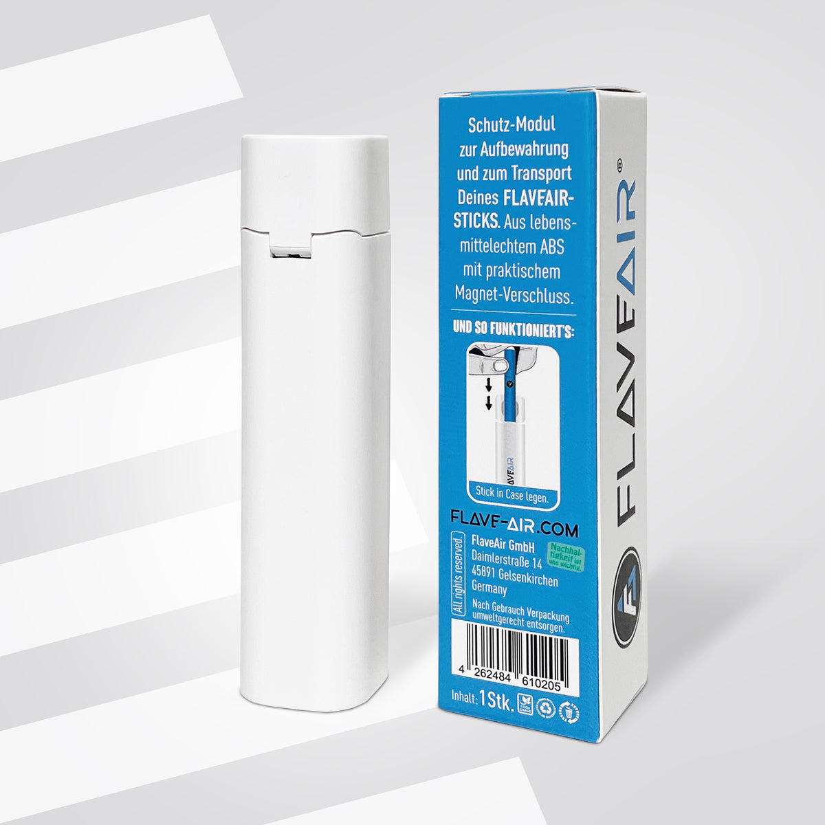 CASE zur Aufbewahrung Deines FLAVEAIR-Sticks. Reinigung vor dem ersten Gebrauch und bei Sortenwechsel. Kühl, trocken und lichtgeschützt lagern.